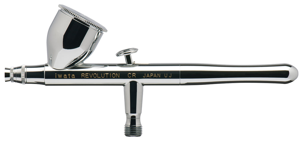 Exclusive to Revolution Series, HP-CR Gravity Feed Dual Action airbrush features a unique, comfort handle. Iwata Revolution HP-CR has a 0.24 oz 7 ml fluid cup with lid that is ideal for color mixing.