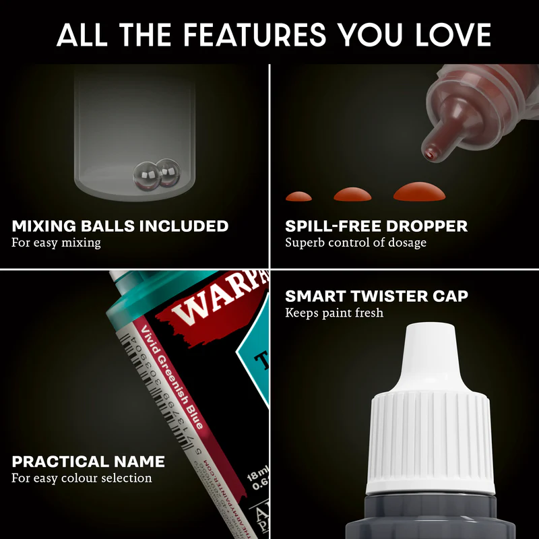 • 10 x 18 Warpaints Fanatic: 8 Acrylics, 2 Washes