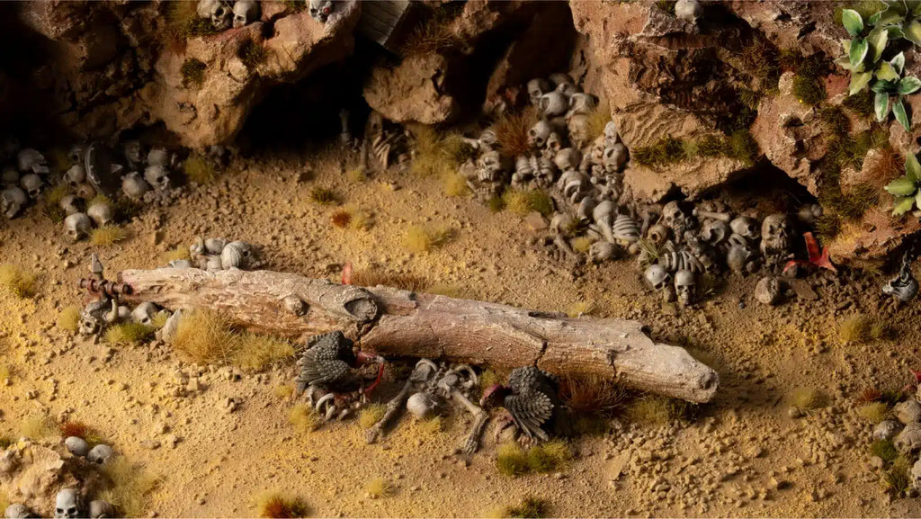 Where vultures endlessly roam, scavenging amidst countless scattered and decayed bodies, lies a battlefield swallowed by Time. Here, the Skulls & Bones of forgotten warriors lie piled up as if some damnatio took place. Shattered helms are still clinging to bone and flesh, and the twisted skulls of fallen orcs whisper tales of fierce creatures fallen in endless War. This is a place where timelines blur, and the stories of all who fought, human and otherwise, are etched into the earth, forever entwined in Death and Memory.