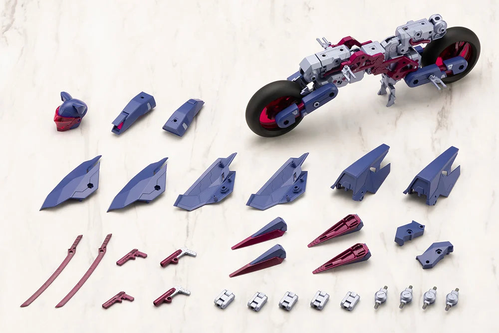 This model also features the same color scheme as the Megami Device AUV Tsukuyomi Regalia model released on the same day! The dark indigo color of the cowl and silver and metallic red/purple of the frame are the exact same colors as Tsukuyomi, allowing the kits to be displayed together just by assembling! Tsukuyomi can ride the bike as is, or a custom vehicle can be built using her equipment, making this an excellent introductory kit for character bike models!