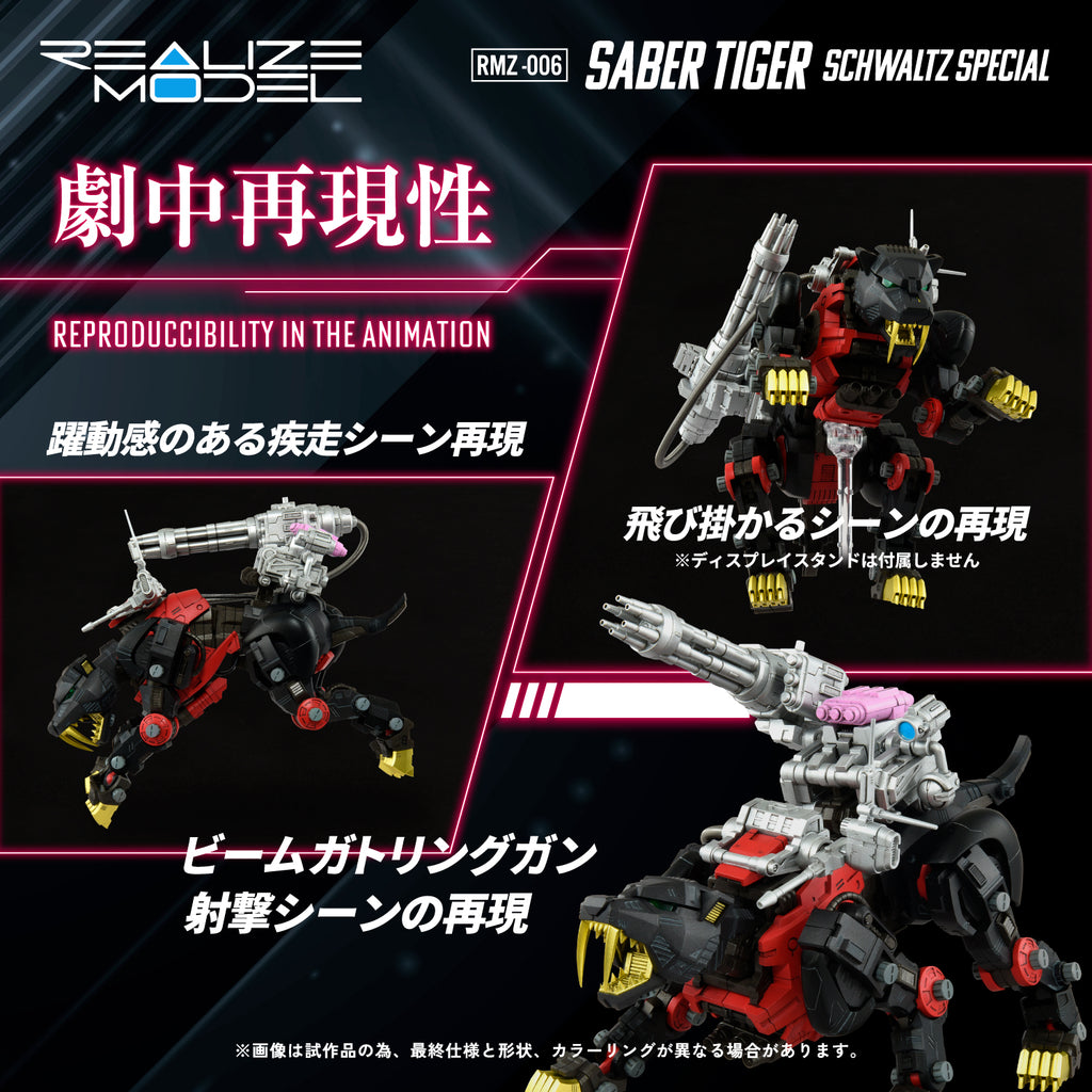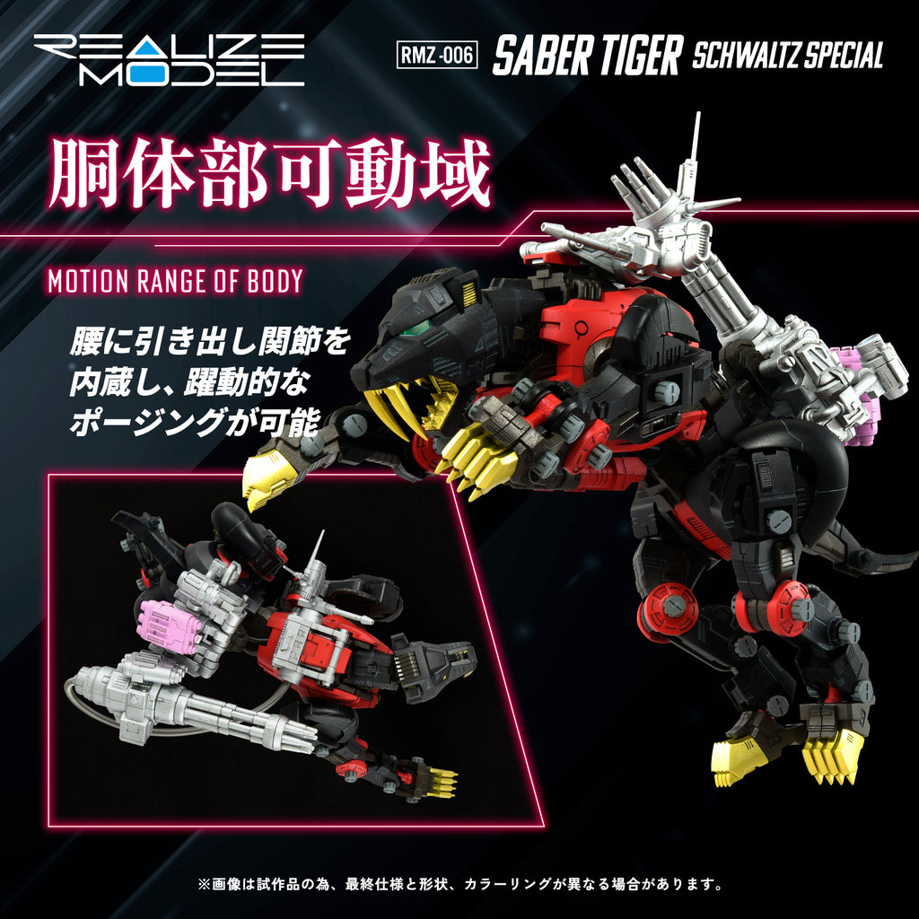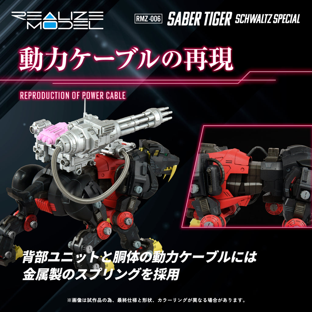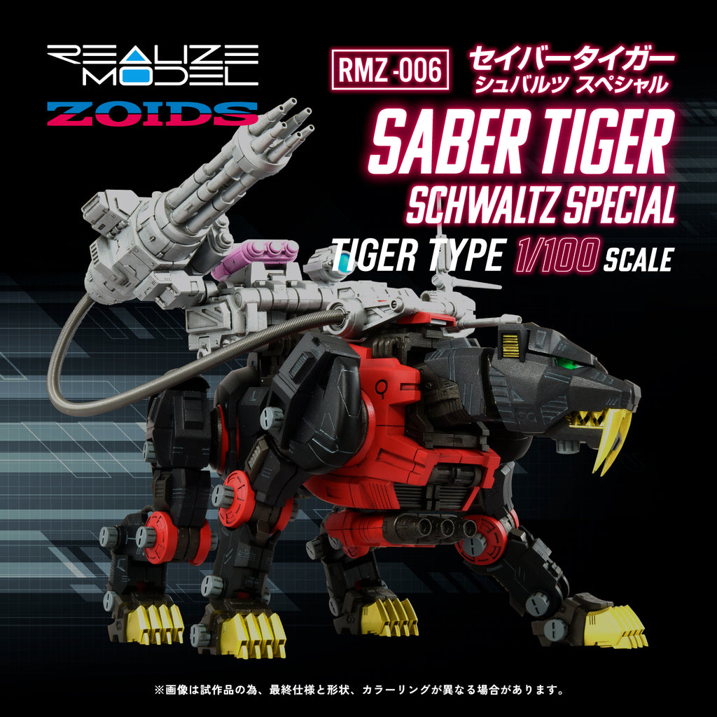 Command the battlefield with the ZOIDS Saber Tiger Schwarz Special! This 1/100-scale model highlights the Saber Tiger’s powerful silhouette and dynamic mobility, with extensive articulation that allows for dramatic running, lunging, and attack poses. The swing mechanism in the neck adds even more versatility, allowing for turning back and roaring. The articulated legs recreate lifelike motion in every stride. The cockpit hatch opens to reveal the pilot seat that can hold the included 1/100-scale figure of Major Schwarz. The back is equipped with a beam gatling unit that faithfully replicates its anime counterpart in both design and color. Altogether, these features deliver an authentic, screen-accurate build with display options that capture the true essence of the Saber Tiger Schwarz.