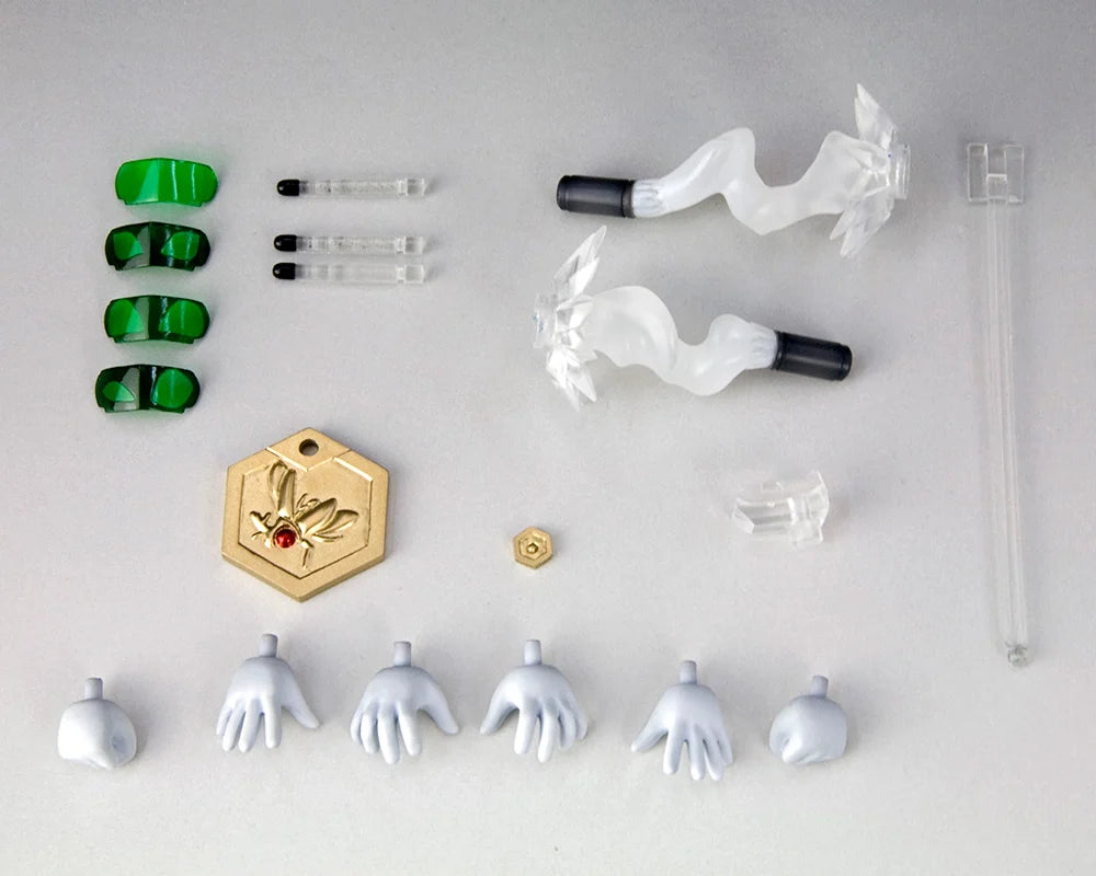 The model kit closely resembles the character’s appearance in the series with the included dialogue parts and a detachable medal for its back.