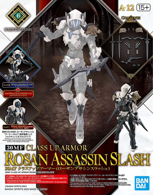 This "Class Up Armor" set from Bandai can be used with their "30MF (30 Minutes Fantasy" series of plastic models. This set of armor and weapons allows your figure to be "classed up" to a higher-tier job with armor replacement -- you can "class up" to Rosan Assassin Slash by combining this armor with that of the Rosan Assassin (sold separately). A long sword and a pair of short swords are included, and the Elemental Core's attribute is "water," and this set has a different face design and coloring from that of the Liber Assassin Slash (sold separately). Place your order today!