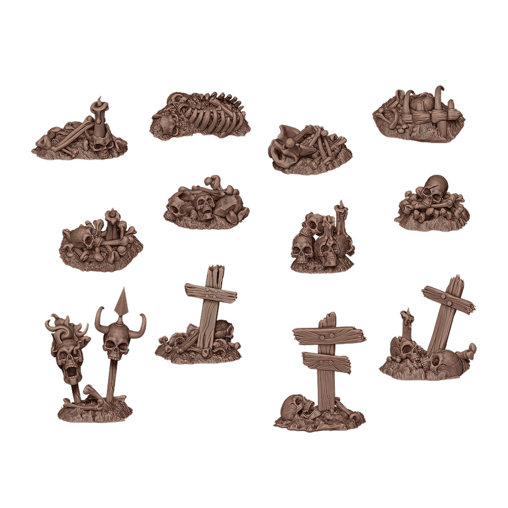 Brittle, scattered fragments of ancient bones, silent witnesses of forgotten times and lives extinguished in cruel battles or forgotten tragedies. Each 3D-printed piece is crafted with meticulous detail to give your bases and gaming tables an atmosphere steeped in mystery.
