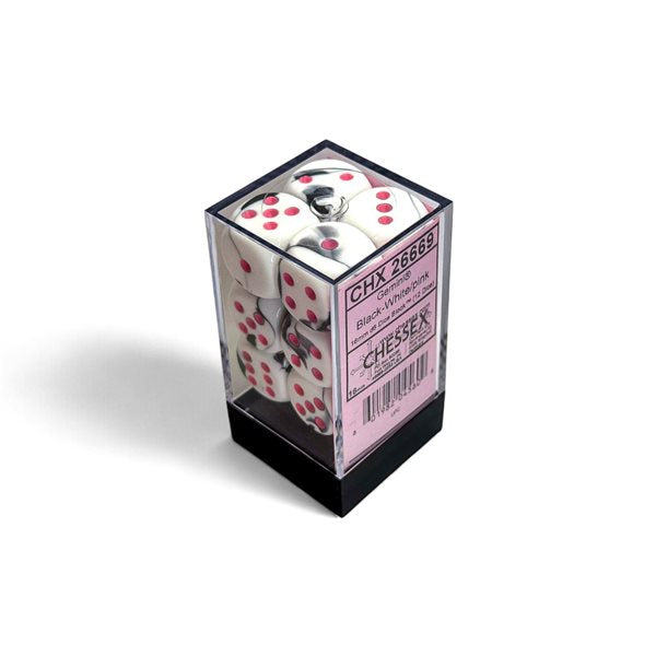 Each set contains 12 Gemini Black-White 16mm d6 dice with pink pips in CHX02805 Display Case w/Lid and Foam Square