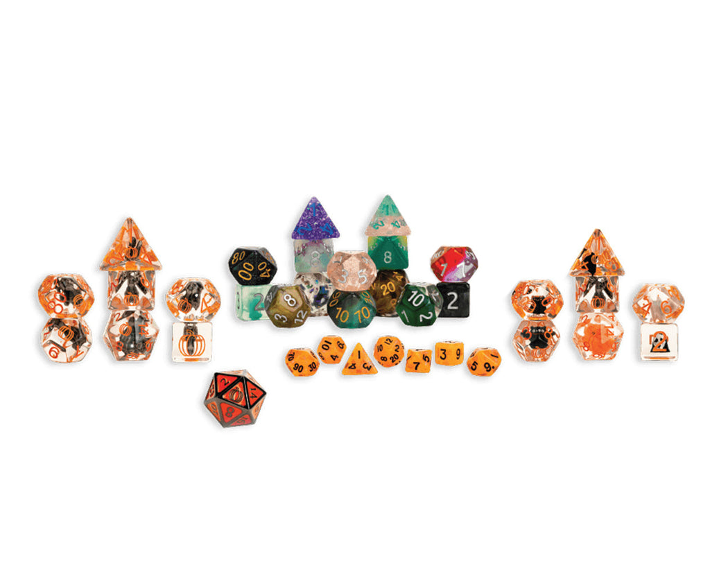 This huge set shaped like a coffin is perfect for display and comes with FOUR full sets of dice! Each calendar includes a mini dice set, two exclusive resin sets, two assorted resin sets, a Halloween-themed dice bag, and a metal d20 for the final day!
