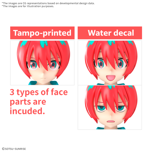 A variety of facial expressions are included. The kits features one tampo-printed face, as well as two faces that can be used with the included water-transfer decals.
