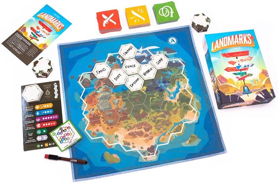 Landmarks is a word game of hidden paths and clever clues. Your party is lost deep in an island jungle, relying on you to guide them to safety and treasure! In this jungle, every word matters. Use strategic wordplay to send a chain of one-word clues. The connections between them will create a path leading to fortune and glory.